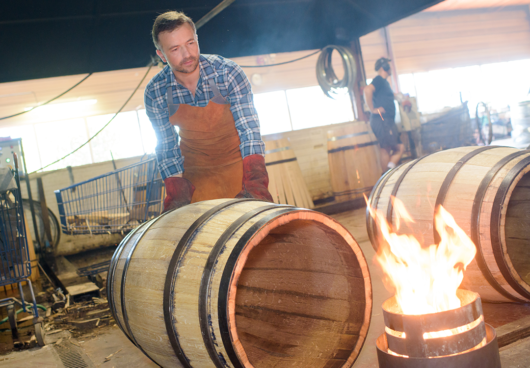 La fabrication d’un fût est un travail délicat et technique, c’est le métier du tonnelier. Ce dernier doit courber les douelles bien droites et rigides pour obtenir la forme arrondie du fût. Pour cela, il a besoin de beaucoup de chaleur pour assouplir les douelles.