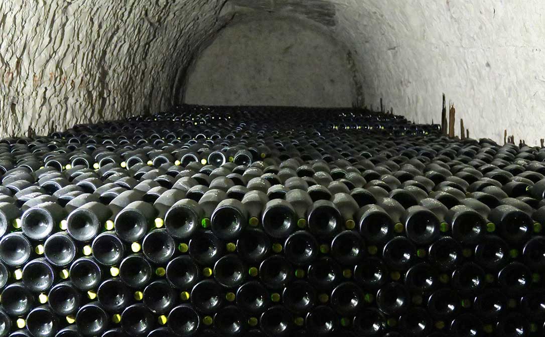 Traditional method sparkling wines are often aged in cave-like cellars for optimal storage conditions