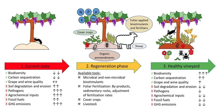Viticulture leverages the ecosystem’s resources to produce wine, its most valuable product, with a unique quality. Traditionally, vineyards supported soil conservation and biodiversity. However, the shift to intensive, industrial viticulture, characterised by heavy ploughing, fertilisers, and pesticide use, has resulted in highly eroded, carbon-depleted, and biologically impoverished vineyards that are more prone to pests and diseases. This soil degradation negatively impacts climate change, water quality, and plant production, prompting a move towards sustainable vineyard management practices such as minimum impact and regenerative viticulture.