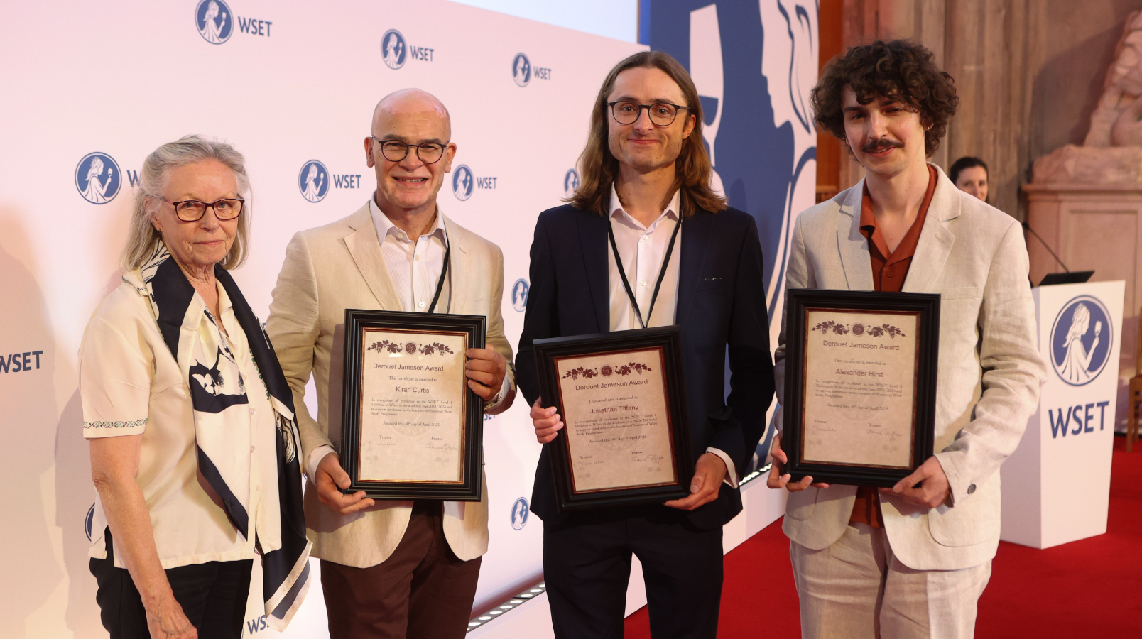 Pictured left to right: Grania Gregson, Derouet Jameson Memorial Award; Kiran Curtis; Jonathan Tiffany; and Alexander Hirst (WSET School London, UK)