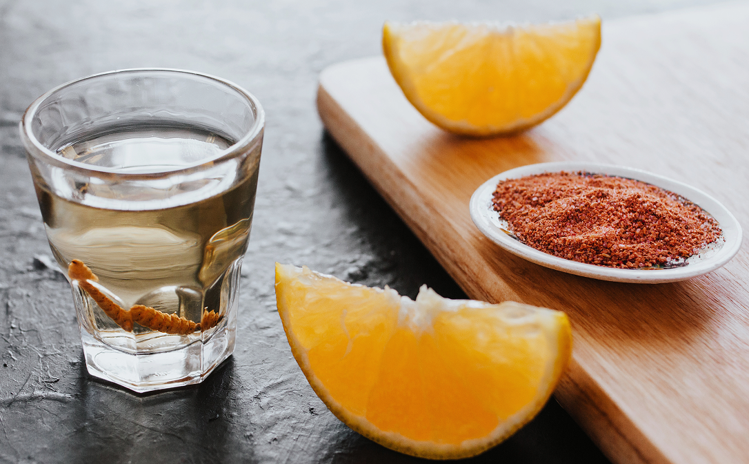 The ‘worm’ seen in some bottled mezcal is actually the larva of a moth which traditionally feeds on the agave plant. It is largely a marketing gimmick, though some producers say it imparts added flavour.
