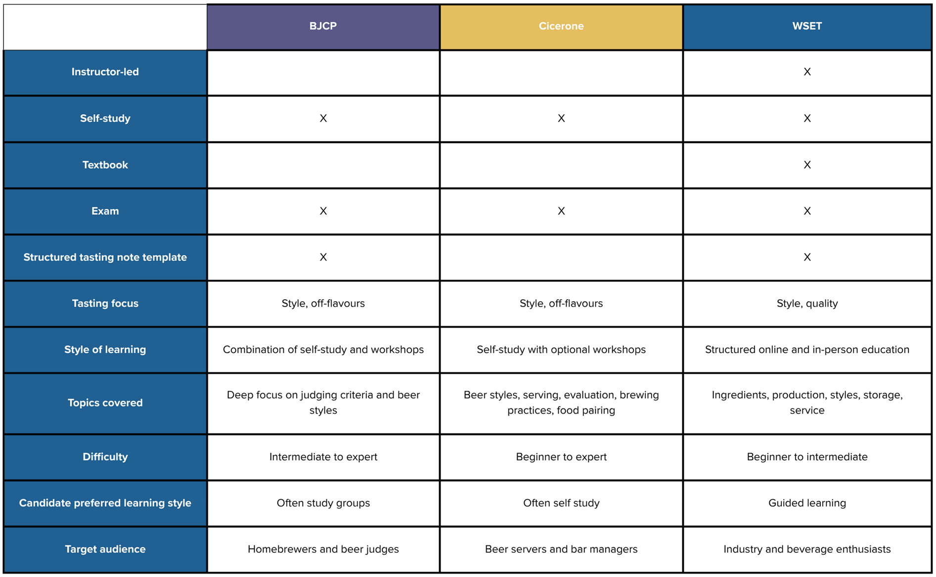When it comes to beer education in the US, three programmes stand out: the Beer Judge Certification Programme (BJCP), the Cicerone Certification Programme, and WSET's beer qualifications. Each has its own history, focus, and ideal audience. But which one is right for you?
