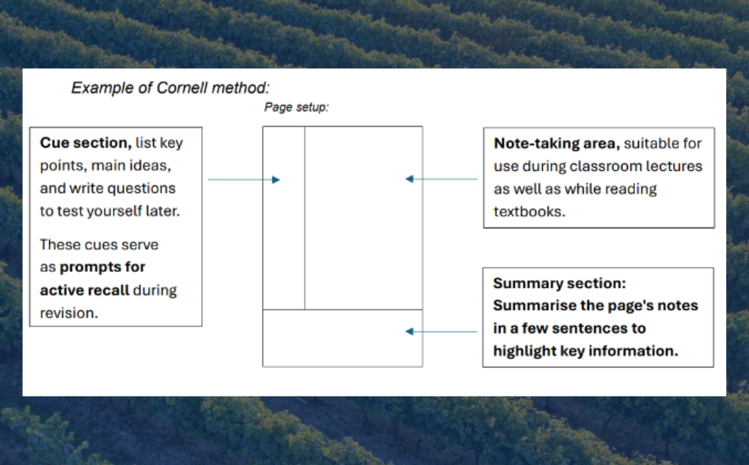 What’s handy about the Cornell Method is that you can have all your thoughts on the topic in one place. Written cues can also serve as prompts for active recall during your revision period, and the comments area for note-taking during classroom lectures.
