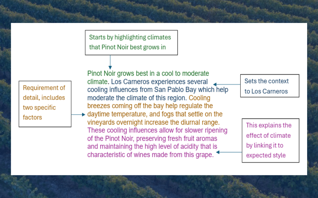 Once you’ve identified your command verb, determine what it is the question is actually asking. Maybe it’s asking about the characteristics of a certain wine, a winemaking process or a grape-growing practice.